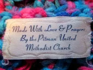 Baptism… Members and friends of our congregation plus babies who are baptized at our church also receive the pieces. Each creation is tagged with a label that reads, “Made with love and prayers by the Pitman United Methodist Church” and is accompanied by a gift card that includes uplifting Bible verses and well wishes.