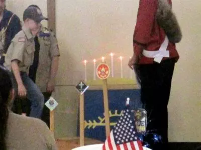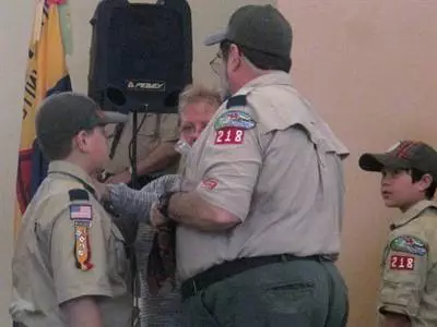 After the opening part, a touching moment of this ceremony occurs right before the scout steps on to the bridge to “cross over.” At this time, the parents remove their son’s cub scout kerchief. There is a sense that the boy had matured to the point where he can begin to take responsibility for himself. He then crosses over the bridge without his parents. When he reaches the other side, he is greeted by representatives of the Boy Scout Troop, and he is then presented with his new Troop 55 kerchief.
