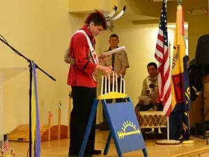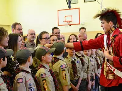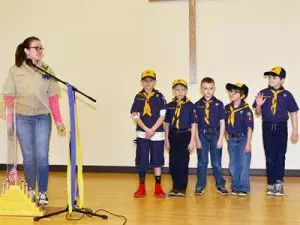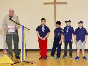 After the celebration, the Blue and Gold breakfast takes on a more serious tone as the pack’s Weebloes receive their “Order of the Arrow” awards and then “cross over” into the Boy Scouts.