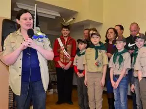 she presented charter certificates to the leaders.  Two charters were given; one to the Cub Scouts (Pack 7218) and one to the Boy Scouts (Troop 7055).  The Girl Scouts and Brownies are a separate organization.