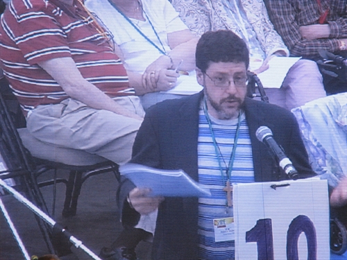 PUMC's Bret Walker, now a local pastor serving Hudson and Ebeneezer United Methodist Churches, makes a point during the discussion of one of the conference's final resolutions on Saturday.