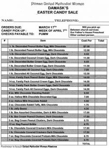 After St. Patrick’s Day, we get deeper into Spring and approach Easter. So, the Mary Circle is also planning an Easter candy sale. These delectable goodies are from the Damask chocolatiers. The order form will be available in the Narthex or from any member of the Mary Circle. Orders are due March 17 and will be available after either service on Sunday, April 7.
