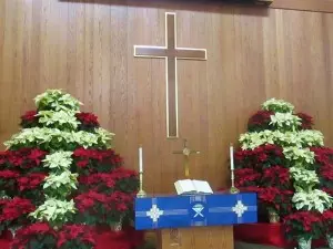 The “Poinsettia Tree” has become a PUMC tradition. This pair of arrangements of Poinsettia plants decorates the front of our sanctuary during the Christmas Season. The arrangements resemble trees, and they surround the alter table. Not only do they add to the Christmas atmosphere, they help link us to those who have gone on to glory. Each plant is usually dedicated in memory of someone.
