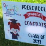 Before the pandemic, our preschool year ended with a big celebration inside the church building. The sanctuary would always be packed with proud parents taking pictures of their kids. In 2020,such indoor meetings weren’t possible, so we took our Preschool graduation on the road and made it a drive-through event. Lawn signs were planted at the students’ homes and the teachers drove by, honking and waving. In 2021 our graduation got rained out.