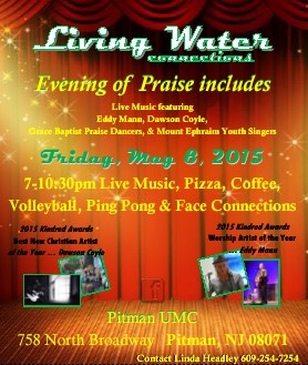 This month’s Living Water Connections on Friday May 8 has been dubbed “An Evening of Praise.” Music from Eddy Mann, Dawson Coyle, Grace Baptist Praise Dancers and the Mt. Ephriam Praise Singers will be featured.