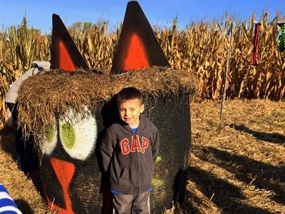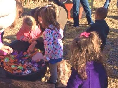 Each child got a chance to pick out a prize from the “cauldron” at the “Witch’s House,” and then we hopped on the wagon for a hayride to the “Fall Fun Field.” Fall Fun? That means picking a pumpkin and enjoying an apple cider doughnut.