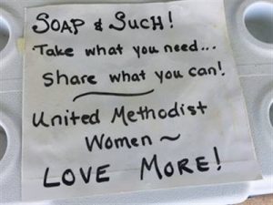 During the pandemic, our United Methodist Women’s group has placed a cooler by the church’s front door. They continually keep it stocked with toiletries and other small items that people might need during this shutdown. Getting to a store, or a Pantry, or even just asking for help can be a difficult thing to do. The “Soap and Such Mini-Pantry” gives people a way to anonymously obtain essential items when the need arises.